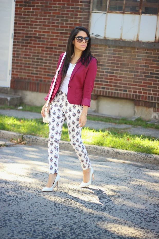 A common theme in my closet is a ton of printed pieces. I've noticed lately how much I have been wearing them and I just can't seem to get enough. I truly am having a love affair with them! I've tried to experiment a little bit and wear prints that I haven't really worn before, like the one on these pants. I'm all about taking a color in a particular print and bringing it out with another piece in my outfit. So I decided to go for burgundy, which I am currently obsessing over this season. This blazer was perfect. I've already worn it three times and only got it the beginning of the month. It was only $19.99! This is why most of my blazers are from H&M. The quality is great and the price point is even better. I always get my moneys worth. If you haven't noticed yet, I am all for white this fall. I recently did a post on Fearless Fashionista explaining how to wear this trend!